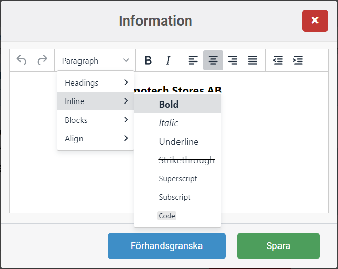 Man kan ändra kvittohuvud, kvittofot och logotype. Tryck på Redigera för att göra ändringar. En grundläggande editerare öppnas.