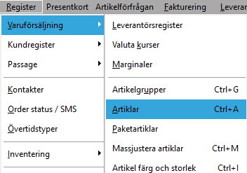 1. Det första man behöver göra är att gå in till artikelregistret i kassan via menyval: