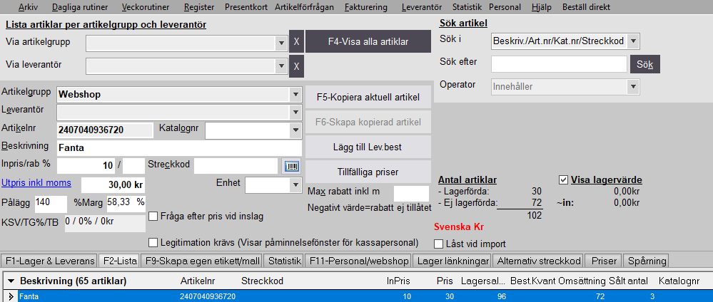 Finns inte produkten i kassans artikelregister behöver ni skapa dem först med minst ifyllda fält: artikelgrupp, artikelnummer, beskrivning och utpris.