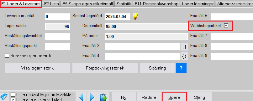 3. Gå in på fliken F1-Lager & Leverans och bocka i "Webbshopartikel" följt av Spara.