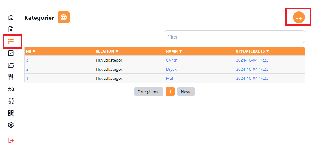 1. Tryck på kategori ikonen på vänstersidan av admin panelen följt av plus ikonen uppe till höger för att skapa en ny kategori.