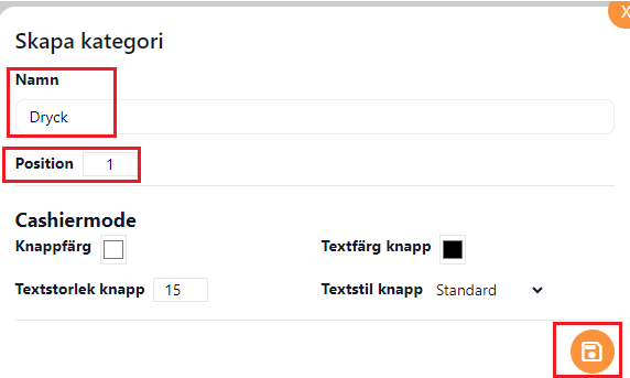 2. Ange namn på kategorin och vilken position som kategorin ska visas för mot slutkunden.