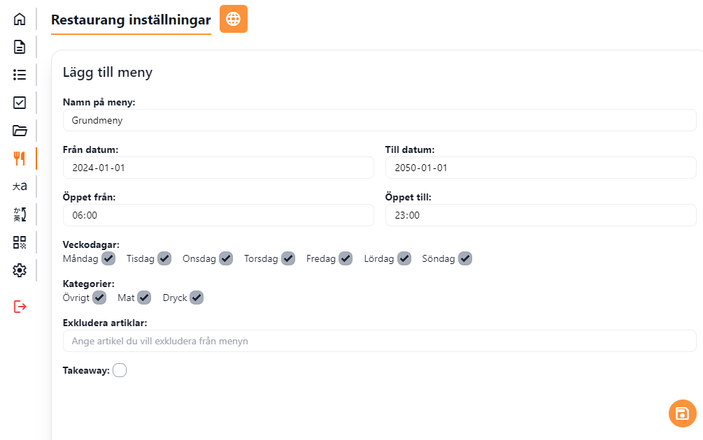 Ovanför visar vi ett exempel där onlineorder butiken nås alla dagar i veckan mellan 06:00-23:00 där alla kategorier är tillgängliga för beställning, men vi kommer gå igenom samtliga fält.