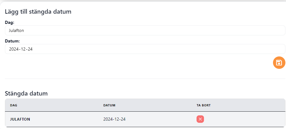 Ni behöver endast skriva en titel på dag fältet, föjlt av att sätta vilket datum det avser följt av spara ikonen. Dessa lägger sedan på listan nedanför för en överblick på stängda datum ni har skapat.