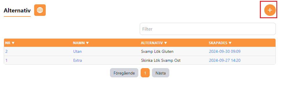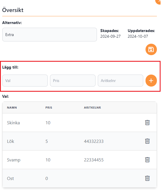 För att lägga till alterantiv fyller ni i ett namn på alternativet, ett pris om alternativet medför en extra kostnad men går även nyttja 0kr, följt av artikelnummer om alternativet ska kopplas till en produkt i erat artikelregister i kassan för att föra statistik/lagersaldo kring dessa.
