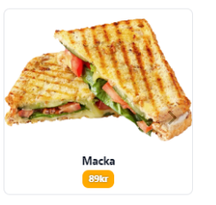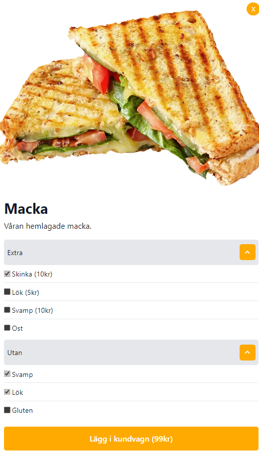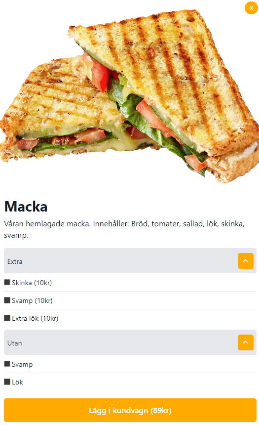 Bild när man klickat på produkten för att gå vidare till beställning av den. Här ser man också resultatet kring möjligheten av att jobba mot alterantiv, slutkunden får valen i detta fallet av våra 2 alterantiv "Extra" och "Utan" att lägga till eller ta bort ingredienser från sin beställning. Detta leder i slutändan även också till chans för merförsäljning.
