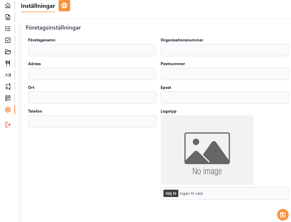 Fyll i samtliga fält med information kring er butik samt tryck "välj fil" för att ladda upp en logga för er onlineorder butik, denna loggan kommer vara synlig för kunder.