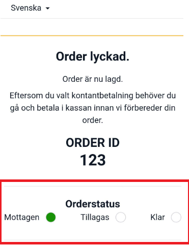 Tillåt orderstatus vy: Denna ibockad lägger till en rad i slutet av beställningen när kund ser att ordern är lagd för att följa sin beställning, se bild nedanför rödmarkerat.
