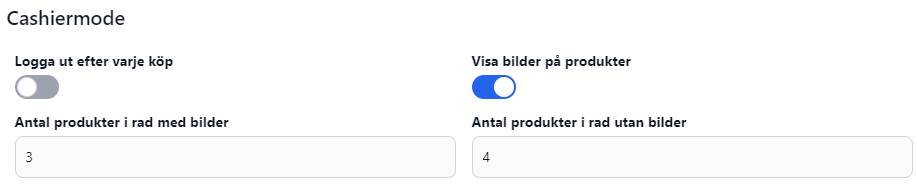 Inställningar för att styra hur cashiermode läget visuellt ska se ut, samt om man vill att kassören loggas ut efter varje köp eller inte beroende på vart man nyttjar cashiermode läget ifrån för extra säkerhet så ingen obehörig kommer åt cashiermode på mobilen/ipaden/annan enhet där kassören är inloggad.