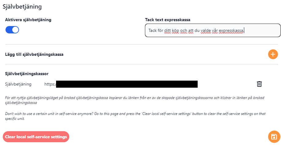 Clear local self-service settings: används endast om man ska ta bort en tidigare självbetjäningskassa länk som inte längre ska nyttjas.
