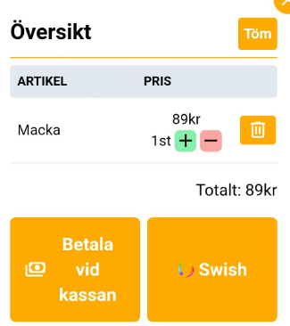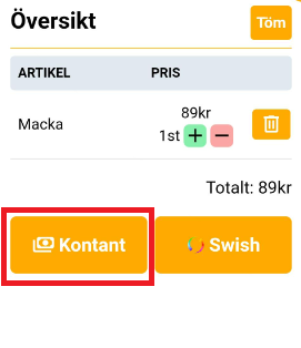 Noterbart är att cashiermode endast har tillgång till kontant, parkera köpet till kassa och swish/Vipps.