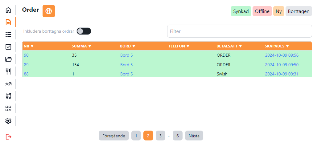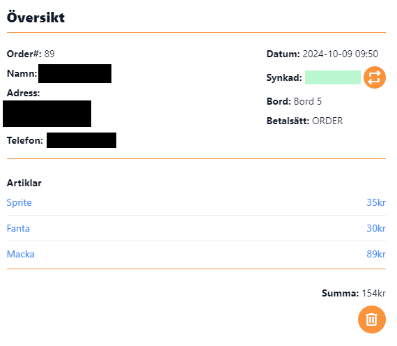 Överskådlig vy för att enkelt se beställningar som lagts, samt om man vill se ytterligare information kring en specifik order så som att beställningen har synkats ner till kassaprogrammet eller om något annat har hänt med beställningen.