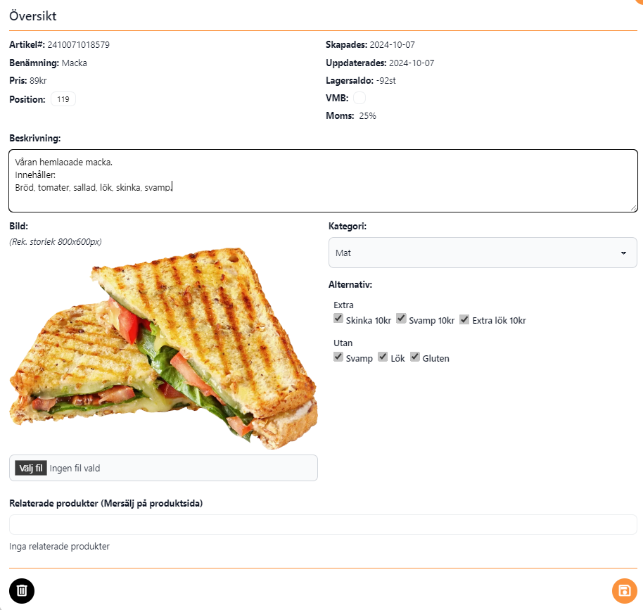 Relaterade produkter: Här kan man skriva in och välja andra produkter från erat sortiment som är relaterade till denna produkten som gör att de dyker upp i samband med beställning av denna produkt för en chans till merförsäljning.