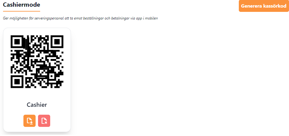 Det går snabbt och smidigt att genererea en QR kod för cashiermode, det är bara att trycka på Generera kassörkod så skapas den upp, det går endast ha 1st cashiermode QR kod då samtliga kassörer nyttjar samma kod för att komma in på detta läget.