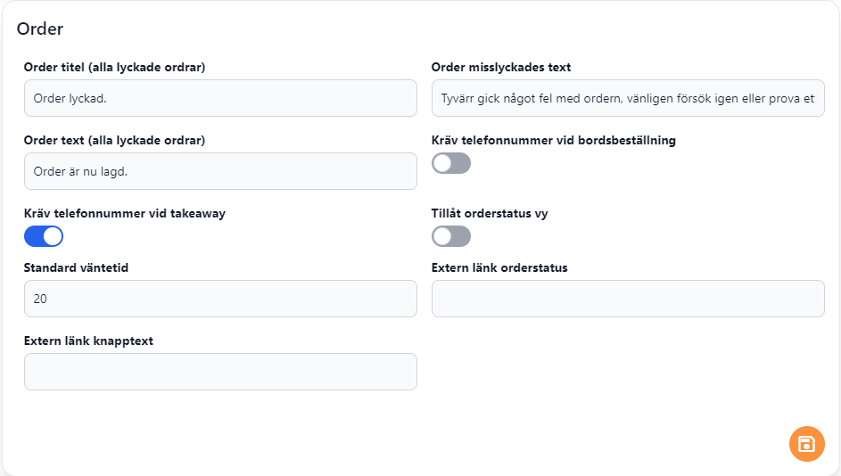 Kräv telefonnummer: Dessa inställningar väljer helt enkelt om kunden som beställer måste fylla i sitt telefonnummer eller inte. Telefonnummer kan vara bra att kräva för att säkerhetsställa att kunden verkligen får sms kring status på deras order under beställningens gång, men inget krav.