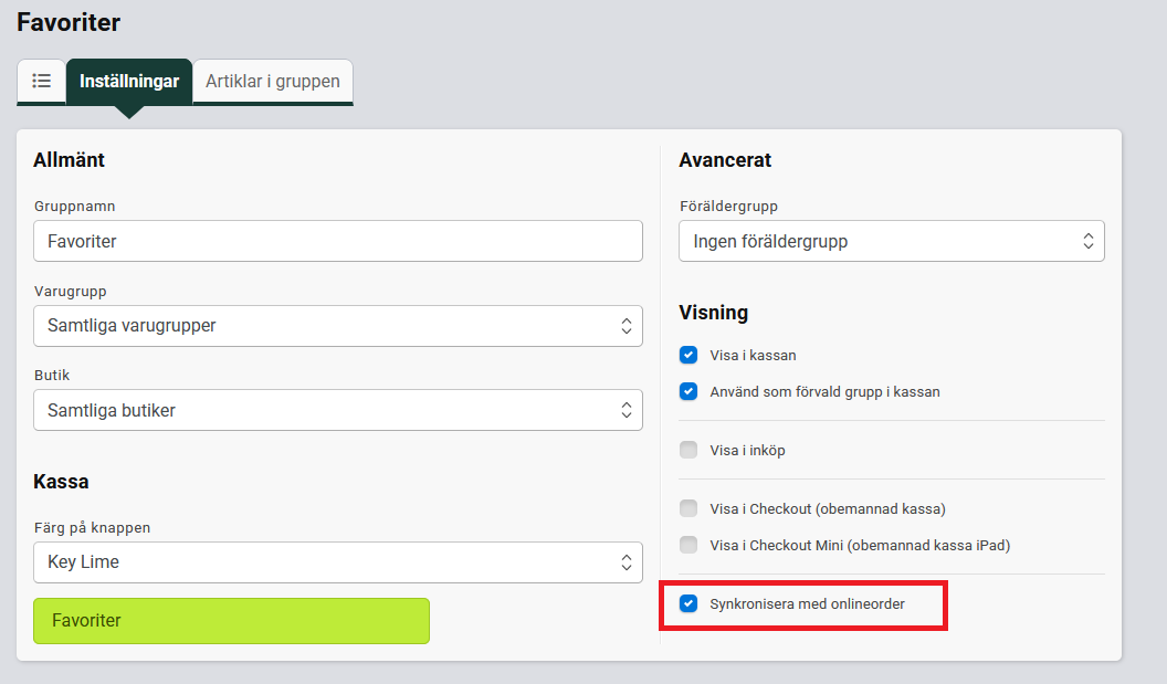 För att lägga till din första artikelgrupp för synkning eller ytterligare artikelgrupper vars artiklar ska synkas så räcker det att gå in på artikelgruppen och bocka i "Synkronisera med onlineorder" följt av att spara.