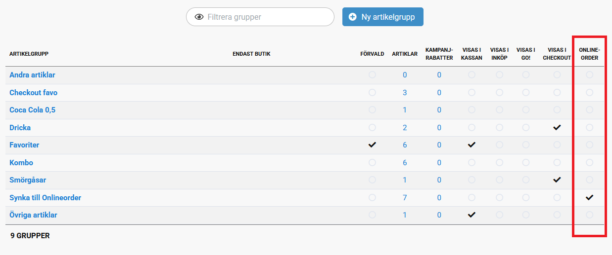 Vi nyttjar erat nuvarande artikelregister för att välja vilka artiklar som ska synkas över till onlineorder systemet, detta görs på artikelgrupp nivå, samtliga artiklar som ligger under en artikelgrupp som är "onlineorder markerad" kommer synkas.