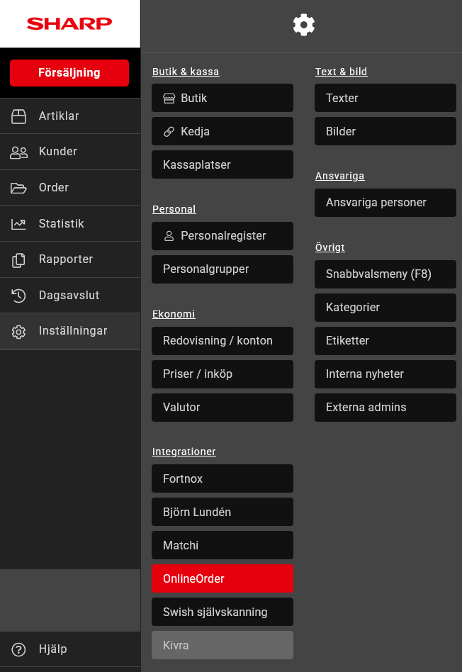 Resterande inställningar finner vi väl inloggad inne i systemet under Inställningar ---> integrationer ---> onlineorder.