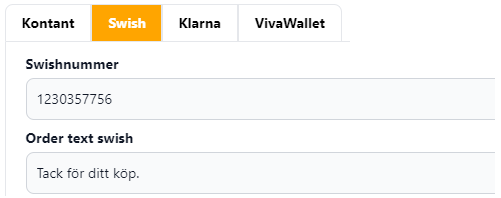 Swish: För att nyttja swish via onlineorder behöver ni ha swish handelsavtal hos er bank med antingen Nutid AB eller Crona software AB som teknisk leverantör.