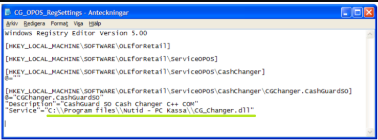 5. Ändra sökvägen till CG_Changer.DLL i registry filen: CG_OPOS_RegSettings.reg Högerklicka på filen och välj redigera/edit. OBS! Det skall vara 2 backslash för varje backslash i sökvägen, enligt nedan: