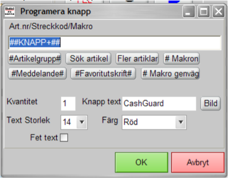 Under menyknappen CashGuard skall följande knappar skapas: