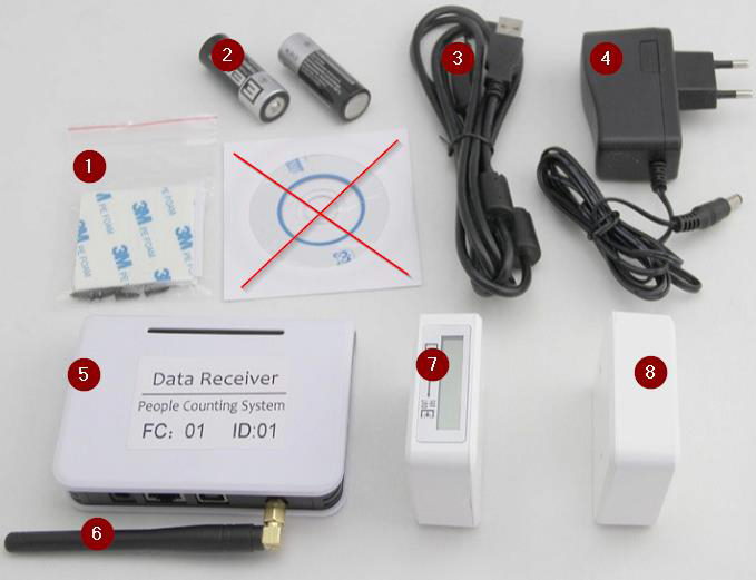 - Wifi-mottagaren (DC). Det är denna enhet som skall anslutas till en dator. Denna kommunicerar sedan trådlöst till besöksräknaren för att inhämta statistik.