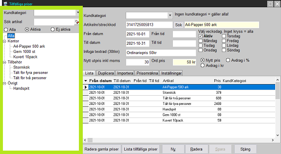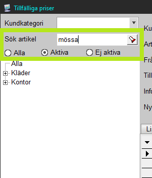 Den vänstra delen av fönstret visar de befintliga tillfälliga priserna som finns registrerade i kassan och dessa är grupperade på varugruppsnivå. Expandera relevant grupp för att se samtliga artiklar som är kopplade till ett tillfälligt pris under denna varugrupp. Det går också bra att använda de övre urvalsfunktionerna för att sortera ut tillfälliga priser på exempelvis kundkategori, aktiva, ej aktiva eller genom att söka efter specifika artiklar i sökfönstret "Sök artikel".