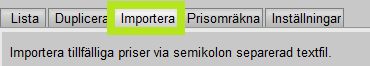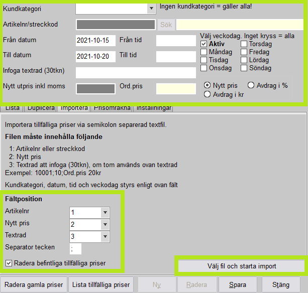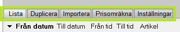 Menyflikarna i den mittersta delen används bland annat för import av tillfälliga priser, omräkning av priser för en hel varugrupp samt inställningar som berör de tillfälliga priserna.