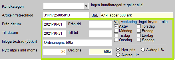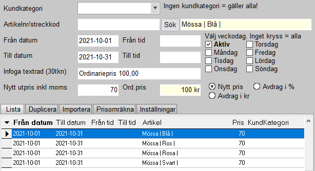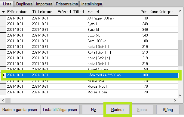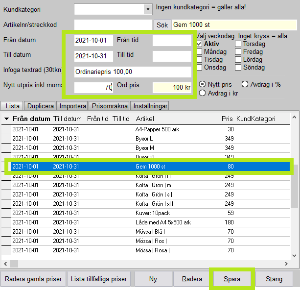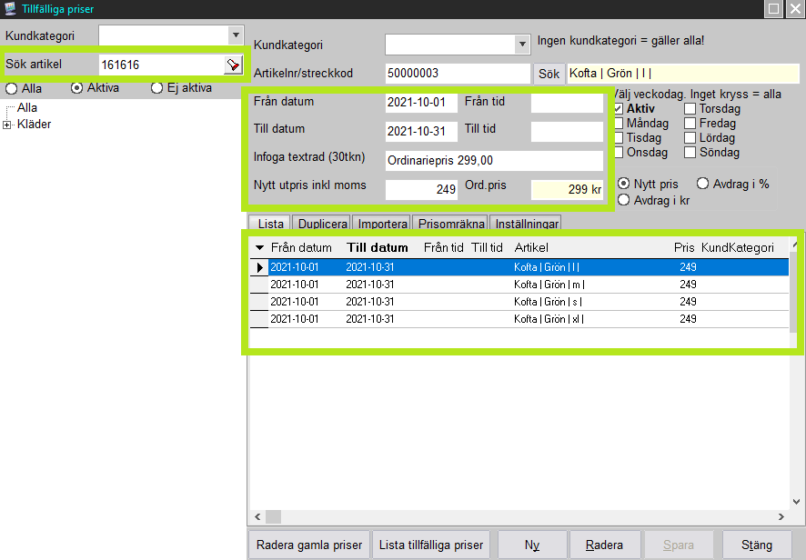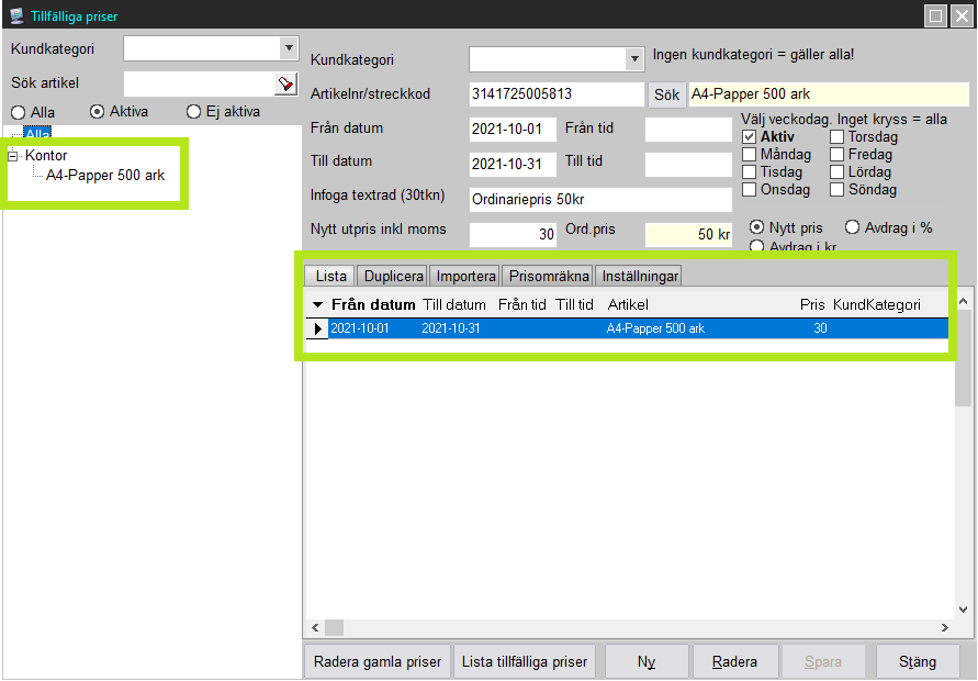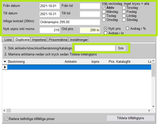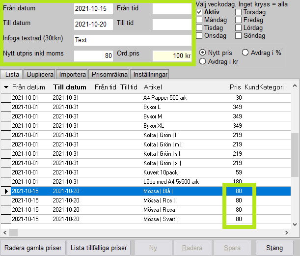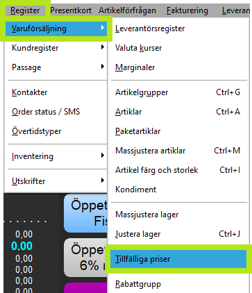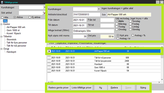 Börja med att öppna administrationsfönstret för de tillfälliga priserna som bland annat nås via menyerna Register - Varuförsäljning - Tillfälliga priser.