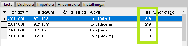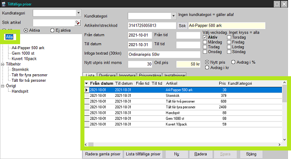 Nere till höger visas det som just nu är markerat i listan till vänster. Som standard är denna markerad att visa "Alla" tillfälliga priser.