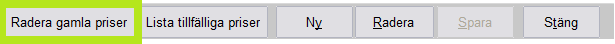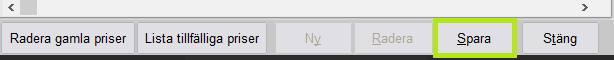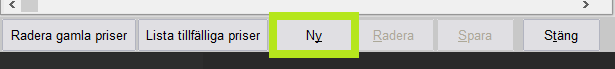 Knapparna längst ner i fönstret används bland annat för att skapa ett nytt tillfälligt pris, radera markerad, skriva ut / lista tillfälliga priser.