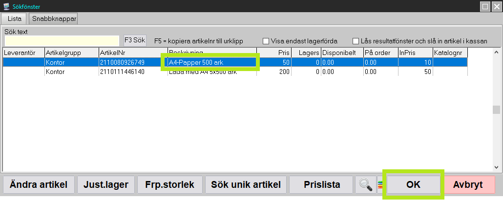 Uppe till höger finns de inställningar som gäller för vald artikel i listan (i urvalsfönstret nedan, markerad med blått).