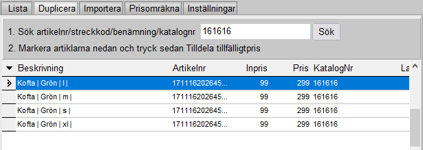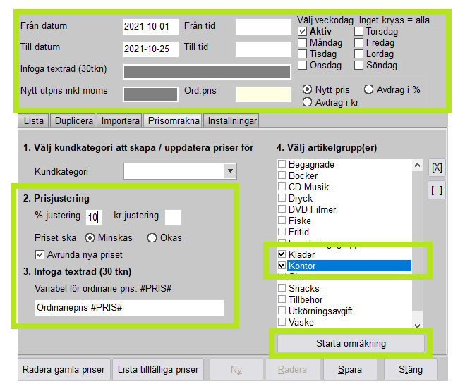 - Prisomräkna / Skapa tillfälliga priser för samtliga artiklar i valda artikelgrupper