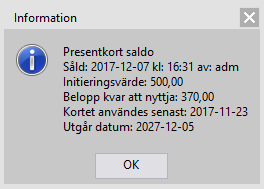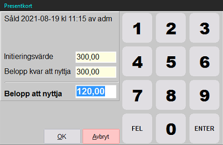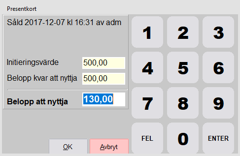Kontroll id (inringat med gult). Fyll i kortID om det är ett magnetkort. Annars det ID som följs i kassan. Det kan t.ex. vara papperspresentkort som redan är numrerade eller som kassörer håller koll på i en pärm etc.