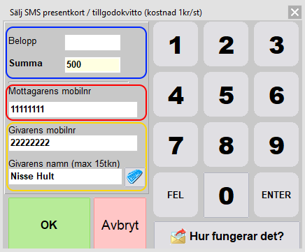 Skriv in givarens mobilnummer följt av Enter samt givarens namn (inringat med gult).