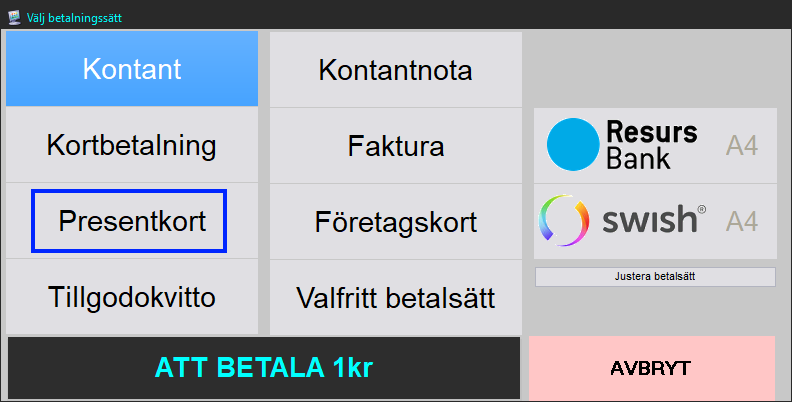 Man kan byta namn på Presentkort i inställningar. I så fall står det namnet på knappen i stället.