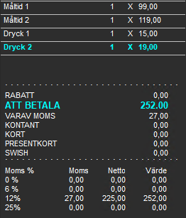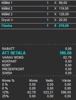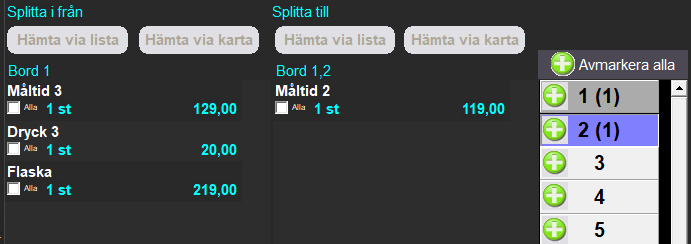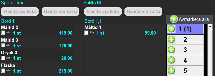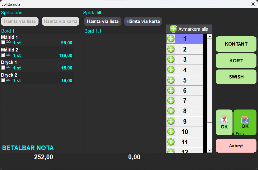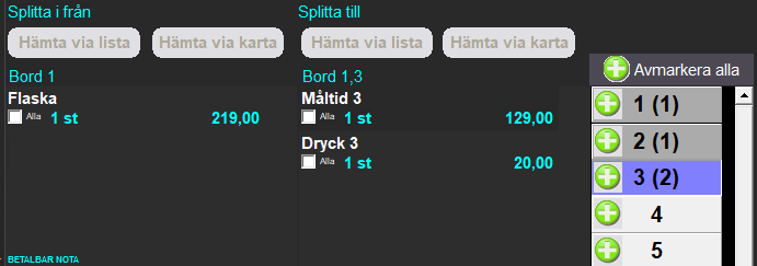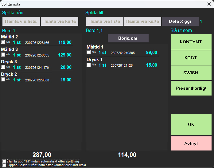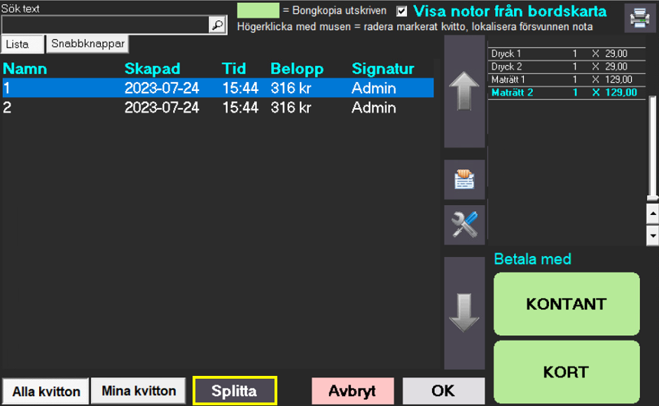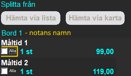 Splitta-funktionerna används via parkerade notor (och bordskarta då den är kopplad till parkerade notor). Det går alltså inte att splitta från skärmkvittot.