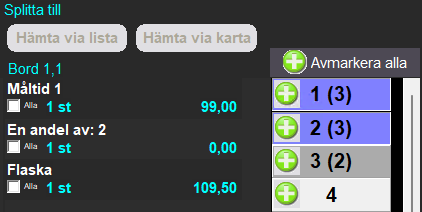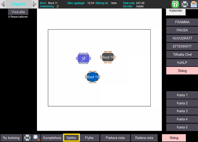 Splitta kommer man åt från flera olika håll. Dels inne i notafunktionen, knappen Splitta. Denna knapp finns även i bordskartan. Det går också att programmera knappar för de olika splittafunktionerna.