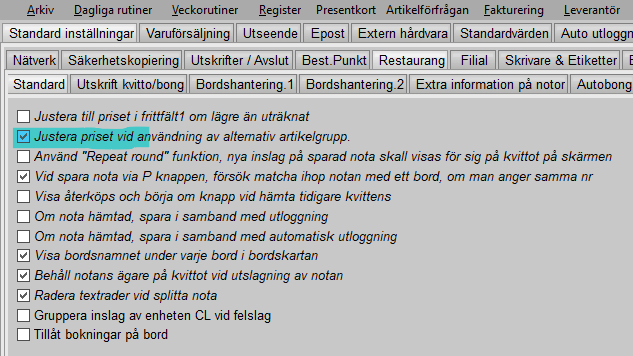 - Gå till menyn Arkiv – Inställningar – Systemuppgifter och välj fliken "Standard Inställning" och underflikarna "Restaurang / Standard".