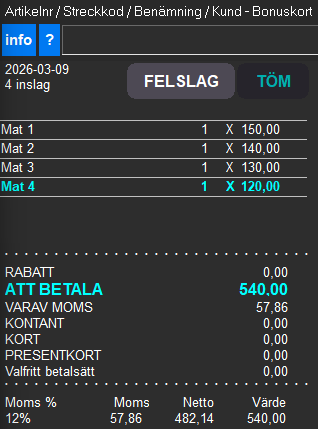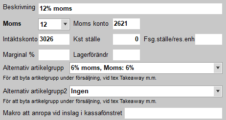 - Artikelgrupper med 12% moms innehållande rätter för "Äta här".