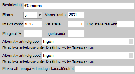 - Artikelgrupp eller artikelgrupper med 6% moms.