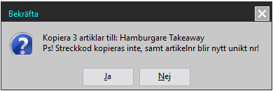 Tryck på knappen "Ja" för att slutföra kopieringen av artiklar. Tryck på knappen "Nej" för att återgå till artikelgrupperna. - Nu kopieras artiklarna och när det är klart får man information om detta.