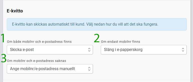 Du kan välja att antingen SMS eller E-postkvitto ska prioriteras och vad som ska händ a om E-postadress eller mobilnummer saknas.
